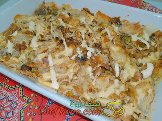 يوضع الفطير في الصينية ويوزع عليه الزبيب وجوز الهند والمكسرات ثم ننزل عليه بالحليب المغلى المحلى بالسكر